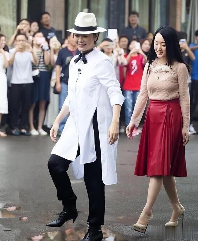 下面这一身黑白配看起来酷飒时髦,让林青霞自带从容气场,特别适合正式场合。白色衬衫长度在膝盖附近,版型很宽松利落,穿在身上特别的遮肉显瘦,领口黑色蝴蝶结领结点缀在颈部,更是增添了精致感。